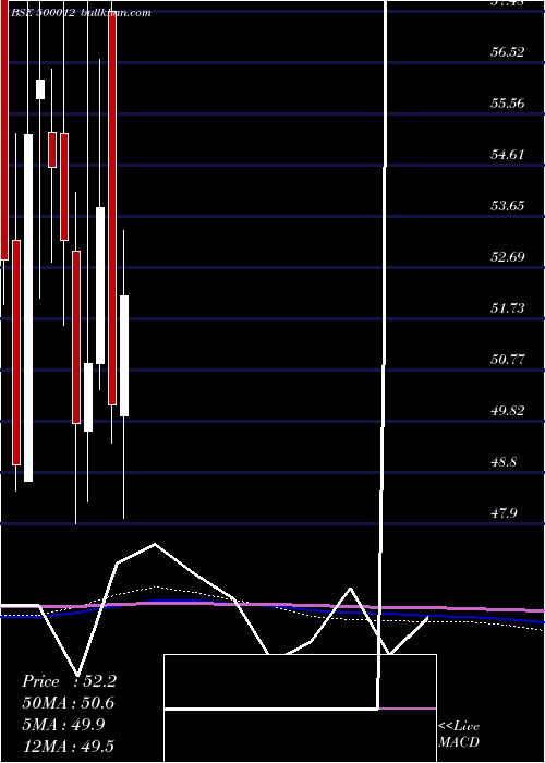 | Date | Closing | Open | Range | Volume | Fri 26 December 2025 | 48.52 (-0.27%) | 48.66 | 48.21 - 49.19 | 1.0595 times | Wed 24 December 2025 | 48.65 (-1.04%) | 49.16 | 48.56 - 49.40 | 1.4157 times | Tue 23 December 2025 | 49.16 (0.24%) | 49.05 | 48.30 - 49.40 | 1.1357 times | Mon 22 December 2025 | 49.04 (1.57%) | 48.50 | 48.50 - 49.50 | 0.8274 times | Fri 19 December 2025 | 48.28 (0.12%) | 48.00 | 48.00 - 49.35 | 0.7401 times | Thu 18 December 2025 | 48.22 (0.06%) | 48.19 | 48.00 - 48.85 | 0.6517 times | Wed 17 December 2025 | 48.19 (-2.07%) | 49.03 | 48.10 - 49.24 | 1.0419 times | Tue 16 December 2025 | 49.21 (-1.34%) | 49.89 | 49.04 - 49.99 | 0.519 times | Mon 15 December 2025 | 49.88 (-0.7%) | 49.51 | 49.51 - 50.15 | 0.801 times | Fri 12 December 2025 | 50.23 (0.38%) | 49.31 | 49.31 - 50.45 | 1.8081 times | Thu 11 December 2025 | 50.04 (-0.04%) | 49.89 | 48.69 - 50.38 | 2.6685 times |