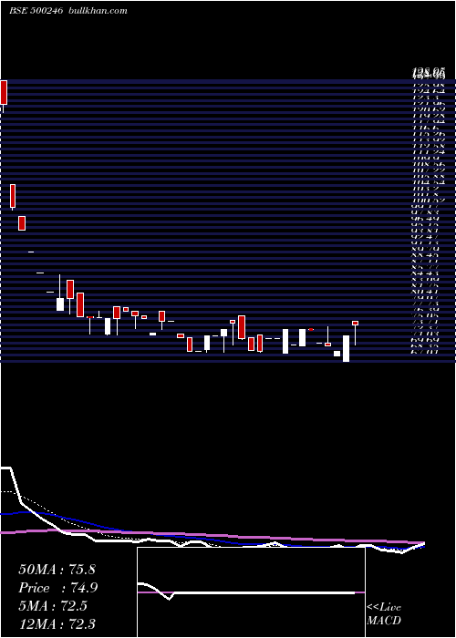 | Date | Closing | Open | Range | Volume | Wed 24 December 2025 | 74.90 (3.32%) | 75.90 | 70.53 - 75.90 | 2.1206 times | Tue 23 December 2025 | 72.49 (4.98%) | 67.01 | 67.01 - 72.50 | 2.168 times | Mon 22 December 2025 | 69.05 (-1.78%) | 68.05 | 68.05 - 69.06 | 1.5583 times | Fri 19 December 2025 | 70.30 (-0.99%) | 71.00 | 70.30 - 74.50 | 0.5014 times | Thu 18 December 2025 | 71.00 (-4.04%) | 71.00 | 71.00 - 71.00 | 0.6775 times | Wed 17 December 2025 | 73.99 (0%) | 74.00 | 73.99 - 74.00 | 0.7385 times | Tue 16 December 2025 | 73.99 (4.95%) | 70.29 | 70.29 - 74.00 | 0.6775 times | Mon 15 December 2025 | 70.50 (-4.73%) | 70.50 | 70.50 - 70.50 | 0.3388 times | Fri 12 December 2025 | 74.00 (2.78%) | 68.70 | 68.70 - 74.00 | 1.023 times | Thu 11 December 2025 | 72.00 (0%) | 72.00 | 72.00 - 72.00 | 0.1965 times | Wed 10 December 2025 | 72.00 (4.03%) | 72.00 | 72.00 - 72.00 | 0.0949 times |