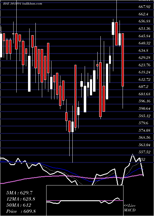 | Date | Closing | Open | Range | Volume | Fri 26 December 2025 | 634.50 (-1.76%) | 634.35 | 632.00 - 642.65 | 0.135 times | Wed 24 December 2025 | 645.85 (2.98%) | 634.95 | 630.00 - 658.55 | 1.5347 times | Tue 23 December 2025 | 627.15 (1.07%) | 627.00 | 620.00 - 671.55 | 1.5437 times | Mon 22 December 2025 | 620.50 (-0.14%) | 615.00 | 614.50 - 634.50 | 0.6841 times | Fri 19 December 2025 | 621.40 (1.44%) | 621.55 | 618.45 - 645.00 | 0.5806 times | Thu 18 December 2025 | 612.55 (-2.76%) | 638.35 | 605.15 - 644.25 | 1.0126 times | Wed 17 December 2025 | 629.95 (-2.88%) | 670.00 | 610.55 - 670.00 | 0.6301 times | Tue 16 December 2025 | 648.65 (1.53%) | 658.65 | 637.55 - 663.35 | 0.225 times | Mon 15 December 2025 | 638.85 (-1.79%) | 650.50 | 633.55 - 670.00 | 0.2835 times | Fri 12 December 2025 | 650.50 (4.93%) | 660.00 | 627.85 - 660.00 | 3.3708 times | Thu 11 December 2025 | 619.95 (0.4%) | 629.10 | 600.00 - 664.95 | 2.2727 times |