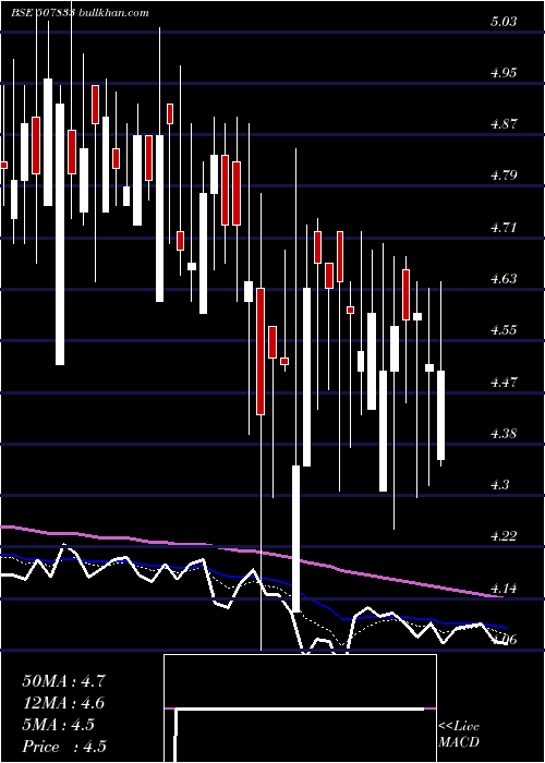 | Date | Closing | Open | Range | Volume | Fri 26 December 2025 | 4.50 (-0.22%) | 4.36 | 4.35 - 4.64 | 0.6357 times | Wed 24 December 2025 | 4.51 (-1.74%) | 4.50 | 4.32 - 4.63 | 1.7793 times | Tue 23 December 2025 | 4.59 (0.22%) | 4.58 | 4.30 - 4.64 | 1.708 times | Mon 22 December 2025 | 4.58 (0.22%) | 4.66 | 4.45 - 4.68 | 0.4836 times | Fri 19 December 2025 | 4.57 (1.56%) | 4.50 | 4.25 - 4.68 | 2.4855 times | Thu 18 December 2025 | 4.50 (-1.96%) | 4.31 | 4.31 - 4.70 | 0.6895 times | Wed 17 December 2025 | 4.59 (1.32%) | 4.44 | 4.44 - 4.69 | 1.0145 times | Tue 16 December 2025 | 4.53 (-1.31%) | 4.50 | 4.43 - 4.72 | 0.2887 times | Mon 15 December 2025 | 4.59 (-1.08%) | 4.60 | 4.38 - 4.64 | 0.4882 times | Fri 12 December 2025 | 4.64 (0.22%) | 4.72 | 4.31 - 4.72 | 0.4271 times | Thu 11 December 2025 | 4.63 (-0.86%) | 4.67 | 4.47 - 4.67 | 1.6236 times |