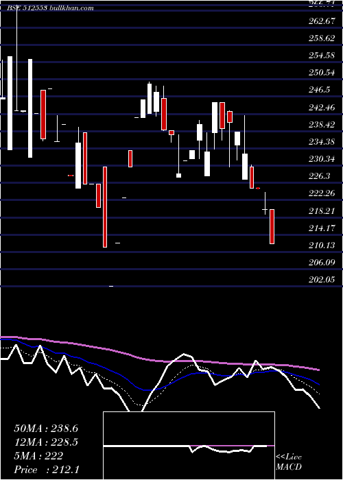 | Date | Closing | Open | Range | Volume | Fri 26 December 2025 | 212.10 (-3.59%) | 220.00 | 212.10 - 220.00 | 0.0799 times | Wed 24 December 2025 | 220.00 (-2.22%) | 220.00 | 219.00 - 224.00 | 0.2226 times | Tue 23 December 2025 | 225.00 (0%) | 225.05 | 225.00 - 225.05 | 0.032 times | Mon 22 December 2025 | 225.00 (-3.43%) | 230.00 | 225.00 - 230.50 | 0.0138 times | Thu 18 December 2025 | 233.00 (-2.18%) | 227.20 | 227.20 - 242.00 | 0.3067 times | Wed 17 December 2025 | 238.20 (-0.96%) | 235.20 | 231.70 - 238.20 | 1.342 times | Tue 16 December 2025 | 240.50 (0.63%) | 243.00 | 230.10 - 243.20 | 1.1077 times | Mon 15 December 2025 | 239.00 (-2.51%) | 245.15 | 236.20 - 245.15 | 2.1589 times | Fri 12 December 2025 | 245.15 (4.99%) | 238.00 | 234.20 - 245.15 | 2.5988 times | Thu 11 December 2025 | 233.50 (-2.71%) | 228.00 | 228.00 - 238.00 | 2.1376 times | Wed 10 December 2025 | 240.00 (2.63%) | 236.20 | 232.00 - 241.00 | 1.1375 times |