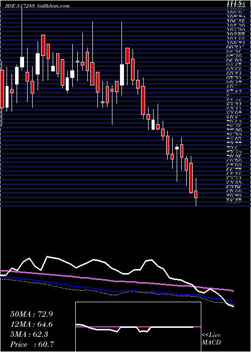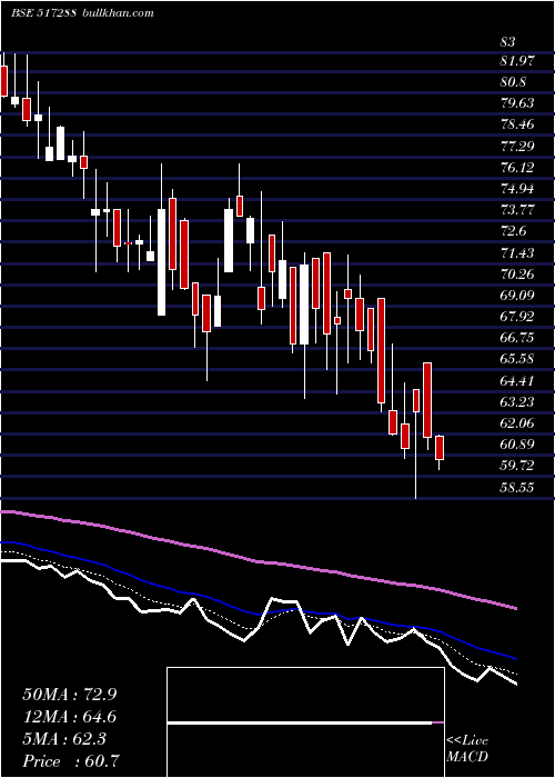 | Date | Closing | Open | Range | Volume | Fri 26 December 2025 | 60.68 (-1.99%) | 61.92 | 60.09 - 61.98 | 1.0975 times | Wed 24 December 2025 | 61.91 (-2.13%) | 66.00 | 61.18 - 66.00 | 1.6831 times | Tue 23 December 2025 | 63.26 (3.2%) | 64.50 | 58.55 - 64.50 | 0.4317 times | Mon 22 December 2025 | 61.30 (-1.26%) | 62.62 | 60.70 - 64.89 | 1.3756 times | Fri 19 December 2025 | 62.08 (-2.63%) | 63.32 | 62.00 - 67.00 | 1.9536 times | Thu 18 December 2025 | 63.76 (-4.29%) | 69.49 | 63.30 - 69.49 | 0.5251 times | Wed 17 December 2025 | 66.62 (-1.67%) | 68.98 | 66.00 - 68.98 | 0.073 times | Tue 16 December 2025 | 67.75 (-2.53%) | 69.51 | 66.15 - 70.80 | 1.556 times | Mon 15 December 2025 | 69.51 (2.09%) | 70.00 | 66.00 - 71.89 | 1.0317 times | Fri 12 December 2025 | 68.09 (0.81%) | 68.49 | 64.25 - 69.85 | 0.2728 times | Thu 11 December 2025 | 67.54 (-2.09%) | 72.00 | 65.60 - 72.00 | 0.4691 times |