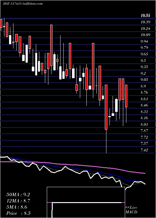 | Date | Closing | Open | Range | Volume | Wed 31 December 2025 | 8.72 (2.71%) | 8.49 | 8.49 - 9.15 | 0.2692 times | Tue 30 December 2025 | 8.49 (-1.96%) | 9.00 | 8.13 - 9.00 | 0.5907 times | Mon 29 December 2025 | 8.66 (0.12%) | 9.15 | 8.05 - 9.15 | 0.4876 times | Fri 26 December 2025 | 8.65 (-0.23%) | 9.15 | 8.21 - 9.15 | 0.9048 times | Wed 24 December 2025 | 8.67 (3.96%) | 8.38 | 8.17 - 8.70 | 1.7458 times | Tue 23 December 2025 | 8.34 (0.85%) | 8.29 | 8.29 - 8.74 | 0.5506 times | Mon 22 December 2025 | 8.27 (3.76%) | 8.26 | 8.06 - 8.45 | 0.7732 times | Fri 19 December 2025 | 7.97 (-8.91%) | 9.00 | 7.42 - 9.00 | 2.9203 times | Thu 18 December 2025 | 8.75 (1.16%) | 8.68 | 8.65 - 8.97 | 0.1776 times | Wed 17 December 2025 | 8.65 (-3.67%) | 9.44 | 8.52 - 9.44 | 1.5803 times | Tue 16 December 2025 | 8.98 (0.9%) | 8.98 | 8.80 - 9.39 | 0.5708 times |
