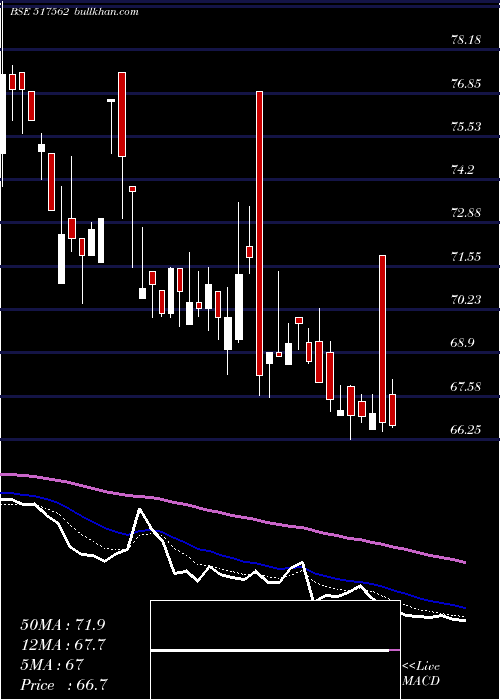 | Date | Closing | Open | Range | Volume | Fri 26 December 2025 | 66.67 (-0.13%) | 67.62 | 66.60 - 68.10 | 0.1765 times | Wed 24 December 2025 | 66.76 (-0.43%) | 71.87 | 66.51 - 71.87 | 0.4301 times | Tue 23 December 2025 | 67.05 (0.15%) | 66.56 | 66.56 - 67.63 | 0.6061 times | Mon 22 December 2025 | 66.95 (-0.06%) | 67.42 | 66.76 - 67.64 | 1.2936 times | Fri 19 December 2025 | 66.99 (-0.21%) | 67.87 | 66.25 - 67.91 | 1.2706 times | Thu 18 December 2025 | 67.13 (-0.53%) | 67.00 | 67.00 - 67.90 | 0.265 times | Wed 17 December 2025 | 67.49 (-0.75%) | 68.90 | 67.09 - 69.24 | 1.4687 times | Tue 16 December 2025 | 68.00 (-0.92%) | 69.24 | 68.00 - 70.25 | 1.0553 times | Mon 15 December 2025 | 68.63 (-1.68%) | 69.22 | 68.59 - 69.64 | 0.2771 times | Fri 12 December 2025 | 69.80 (0.9%) | 70.00 | 69.00 - 70.00 | 3.1571 times | Thu 11 December 2025 | 69.18 (0.58%) | 68.55 | 68.55 - 69.80 | 0.1739 times |