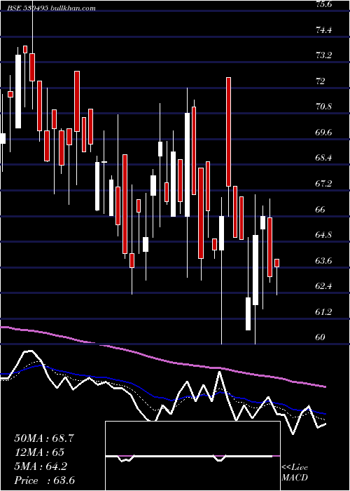 | Date | Closing | Open | Range | Volume | Wed 24 December 2025 | 63.63 (0.76%) | 63.99 | 62.30 - 63.99 | 0.6687 times | Tue 23 December 2025 | 63.15 (-4.3%) | 65.90 | 62.90 - 66.80 | 1.4716 times | Mon 22 December 2025 | 65.99 (1.35%) | 65.39 | 61.65 - 66.48 | 0.6244 times | Fri 19 December 2025 | 65.11 (4.7%) | 61.86 | 60.00 - 66.99 | 4.7458 times | Thu 18 December 2025 | 62.19 (-4.18%) | 60.65 | 60.65 - 65.00 | 0.473 times | Wed 17 December 2025 | 64.90 (-0.15%) | 66.90 | 64.90 - 66.90 | 0.0895 times | Tue 16 December 2025 | 65.00 (-3.56%) | 67.39 | 65.00 - 67.39 | 0.0453 times | Mon 15 December 2025 | 67.40 (2.12%) | 72.49 | 66.00 - 72.49 | 0.4227 times | Fri 12 December 2025 | 66.00 (2.47%) | 64.41 | 60.00 - 66.87 | 1.1251 times | Thu 11 December 2025 | 64.41 (-2.76%) | 64.92 | 64.00 - 64.92 | 0.3338 times | Wed 10 December 2025 | 66.24 (3.5%) | 68.56 | 65.00 - 68.56 | 0.1138 times |