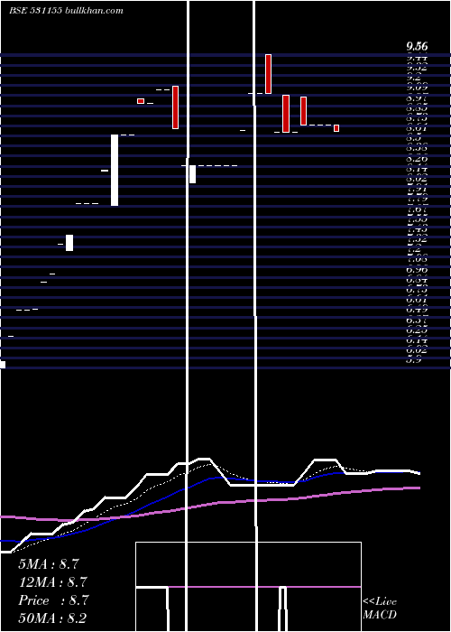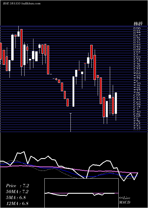 | Date | Closing | Open | Range | Volume | Fri 26 December 2025 | 7.21 (4.95%) | 7.01 | 6.87 - 7.21 | 0.104 times | Wed 24 December 2025 | 6.87 (4.89%) | 6.87 | 6.87 - 6.87 | 0.1777 times | Tue 23 December 2025 | 6.55 (4.8%) | 6.56 | 5.94 - 6.56 | 3.6184 times | Mon 22 December 2025 | 6.25 (0%) | 6.25 | 6.25 - 6.25 | 0.0402 times | Fri 19 December 2025 | 6.25 (0.48%) | 6.53 | 6.25 - 6.53 | 1.7874 times | Thu 18 December 2025 | 6.22 (-5.61%) | 7.19 | 6.17 - 7.24 | 1.504 times | Wed 17 December 2025 | 6.59 (-5.86%) | 7.03 | 6.39 - 7.55 | 0.9641 times | Tue 16 December 2025 | 7.00 (-1.55%) | 7.00 | 7.00 - 7.00 | 0.6707 times | Fri 12 December 2025 | 7.11 (-9.2%) | 7.81 | 7.05 - 7.83 | 0.2934 times | Thu 11 December 2025 | 7.83 (9.51%) | 7.55 | 6.55 - 7.83 | 0.84 times | Wed 10 December 2025 | 7.15 (-6.54%) | 7.85 | 7.13 - 8.39 | 0.1258 times |