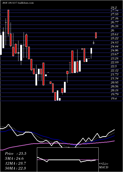 | Date | Closing | Open | Range | Volume | Wed 24 December 2025 | 25.50 (2%) | 26.00 | 25.45 - 26.00 | 0.4247 times | Tue 23 December 2025 | 25.00 (2.04%) | 24.99 | 24.87 - 25.20 | 1.3072 times | Mon 22 December 2025 | 24.50 (4.26%) | 24.00 | 23.50 - 24.50 | 1.2806 times | Fri 19 December 2025 | 23.50 (0%) | 23.50 | 23.50 - 23.50 | 0.5668 times | Thu 18 December 2025 | 23.50 (1.38%) | 23.18 | 23.18 - 23.50 | 0.021 times | Wed 17 December 2025 | 23.18 (-5%) | 24.47 | 23.18 - 24.47 | 0.366 times | Tue 16 December 2025 | 24.40 (4.68%) | 24.47 | 24.33 - 24.47 | 1.1756 times | Mon 15 December 2025 | 23.31 (5%) | 22.26 | 22.20 - 23.31 | 0.8936 times | Fri 12 December 2025 | 22.20 (-4.31%) | 23.20 | 22.10 - 24.36 | 2.0918 times | Thu 11 December 2025 | 23.20 (4.98%) | 22.10 | 22.10 - 23.20 | 1.8728 times | Wed 10 December 2025 | 22.10 (-4.33%) | 24.25 | 22.10 - 24.25 | 6.5607 times |