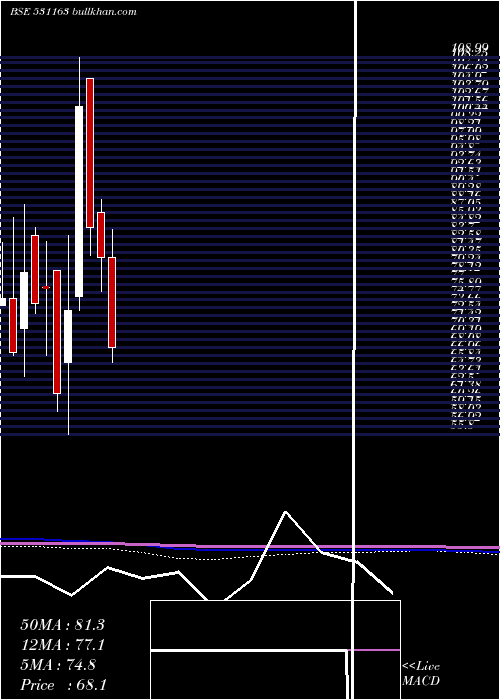 | Date | Closing | Open | Range | Volume | Mon 29 December 2025 | 68.11 (-11.38%) | 76.88 | 66.00 - 76.88 | 4.7736 times | Fri 26 December 2025 | 76.86 (-1.12%) | 79.60 | 74.00 - 79.60 | 1.5735 times | Wed 24 December 2025 | 77.73 (-2.59%) | 80.00 | 73.00 - 80.00 | 0.8501 times | Tue 23 December 2025 | 79.80 (0.63%) | 82.00 | 77.90 - 82.00 | 0.2808 times | Mon 22 December 2025 | 79.30 (-0.88%) | 81.50 | 74.00 - 81.50 | 0.9099 times | Fri 19 December 2025 | 80.00 (1.98%) | 77.00 | 74.70 - 80.50 | 0.1183 times | Thu 18 December 2025 | 78.45 (-1.94%) | 80.00 | 74.70 - 80.00 | 0.1147 times | Wed 17 December 2025 | 80.00 (3.23%) | 74.70 | 74.70 - 81.80 | 0.0018 times | Tue 16 December 2025 | 77.50 (-1.29%) | 82.00 | 77.50 - 83.95 | 0.4486 times | Mon 15 December 2025 | 78.51 (-1.86%) | 80.00 | 77.30 - 82.01 | 0.9286 times | Fri 12 December 2025 | 80.00 (2.56%) | 78.00 | 78.00 - 80.00 | 0.0948 times |