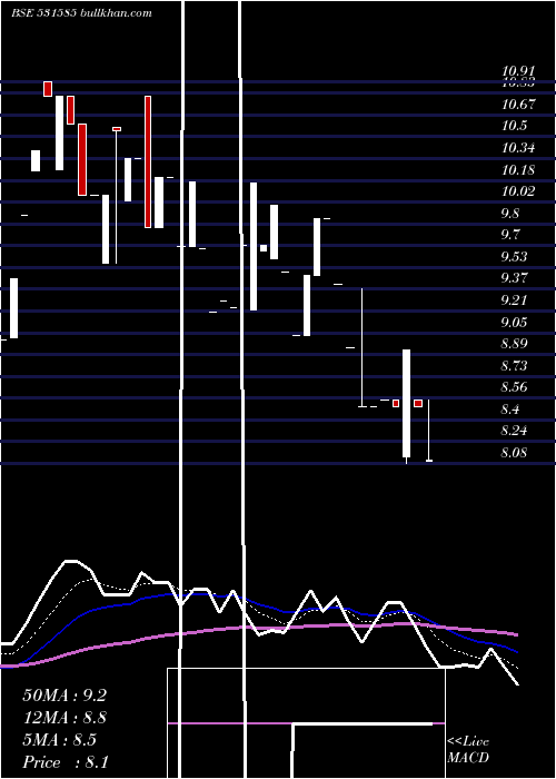 | Date | Closing | Open | Range | Volume | Wed 24 December 2025 | 8.50 (-4.71%) | 8.55 | 8.50 - 8.55 | 0.4937 times | Tue 23 December 2025 | 8.92 (4.94%) | 8.13 | 8.08 - 8.92 | 0.1159 times | Mon 22 December 2025 | 8.50 (-0.58%) | 8.55 | 8.50 - 8.55 | 0.163 times | Fri 19 December 2025 | 8.55 (0.59%) | 8.55 | 8.55 - 8.55 | 3.5193 times | Thu 18 December 2025 | 8.50 (0%) | 8.50 | 8.50 - 8.50 | 0.0008 times | Wed 17 December 2025 | 8.50 (-4.92%) | 8.50 | 8.50 - 9.38 | 4.0373 times | Tue 16 December 2025 | 8.94 (-4.99%) | 8.94 | 8.94 - 8.94 | 0.7313 times | Mon 15 December 2025 | 9.41 (-4.95%) | 9.41 | 9.41 - 9.41 | 0.9112 times | Fri 12 December 2025 | 9.90 (0%) | 9.90 | 9.90 - 9.90 | 0.0008 times | Thu 11 December 2025 | 9.90 (4.43%) | 9.48 | 9.48 - 9.90 | 0.0268 times | Wed 10 December 2025 | 9.48 (4.98%) | 9.03 | 9.03 - 9.48 | 0.0089 times |
