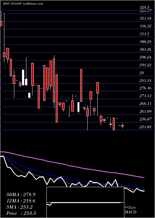| Date | Closing | Open | Range | Volume | Wed 24 December 2025 | 253.50 (-0.22%) | 254.05 | 252.05 - 255.50 | 0.4841 times | Tue 23 December 2025 | 254.05 (-1.68%) | 254.05 | 254.05 - 254.05 | 0.0151 times | Mon 22 December 2025 | 258.40 (2.93%) | 258.50 | 258.25 - 258.50 | 0.0151 times | Fri 19 December 2025 | 251.05 (-1.32%) | 259.00 | 251.05 - 259.00 | 0.0106 times | Thu 18 December 2025 | 254.40 (-1.78%) | 255.10 | 253.00 - 259.00 | 1.0786 times | Wed 17 December 2025 | 259.00 (0.78%) | 259.00 | 259.00 - 259.00 | 0.0885 times | Tue 16 December 2025 | 257.00 (0.14%) | 258.20 | 255.80 - 258.25 | 1.4961 times | Mon 15 December 2025 | 256.65 (-6.64%) | 259.85 | 254.00 - 261.00 | 2.9453 times | Fri 12 December 2025 | 274.90 (4.43%) | 281.85 | 260.00 - 281.85 | 1.5407 times | Thu 11 December 2025 | 263.25 (-2.86%) | 265.00 | 260.65 - 266.00 | 2.3258 times | Wed 10 December 2025 | 271.00 (4.21%) | 275.90 | 260.25 - 275.90 | 0.5325 times |