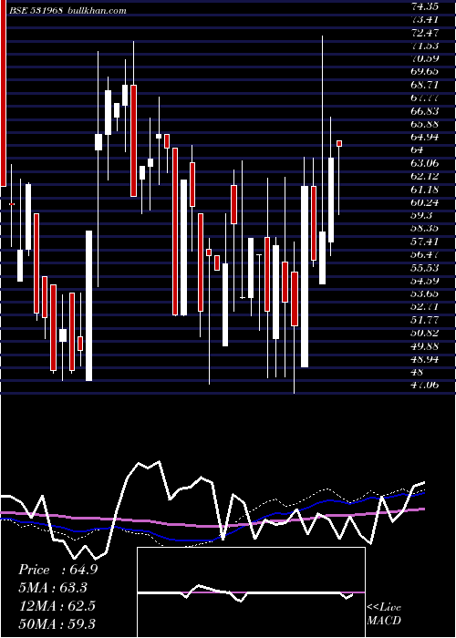 | Date | Closing | Open | Range | Volume | Wed 24 December 2025 | 64.90 (7.45%) | 64.90 | 64.90 - 64.90 | 0.0021 times | Tue 23 December 2025 | 60.40 (-7.48%) | 64.90 | 59.95 - 64.90 | 0.0637 times | Mon 22 December 2025 | 65.28 (2%) | 65.28 | 65.28 - 65.28 | 0.0042 times | Fri 19 December 2025 | 64.00 (6.47%) | 56.99 | 56.99 - 64.00 | 0.017 times | Thu 18 December 2025 | 60.11 (-8.92%) | 61.10 | 60.11 - 61.10 | 0.1359 times | Wed 17 December 2025 | 66.00 (3.81%) | 60.10 | 60.00 - 66.00 | 1.4628 times | Tue 16 December 2025 | 63.58 (9.6%) | 58.01 | 58.01 - 67.00 | 0.7941 times | Mon 15 December 2025 | 58.01 (-1.18%) | 58.00 | 58.00 - 58.01 | 0.2187 times | Fri 12 December 2025 | 58.70 (-9.37%) | 60.00 | 58.30 - 60.00 | 0.0573 times | Thu 11 December 2025 | 64.77 (-1.04%) | 62.51 | 58.20 - 65.50 | 7.2442 times | Wed 10 December 2025 | 65.45 (2.27%) | 72.85 | 61.05 - 72.85 | 0.4437 times |