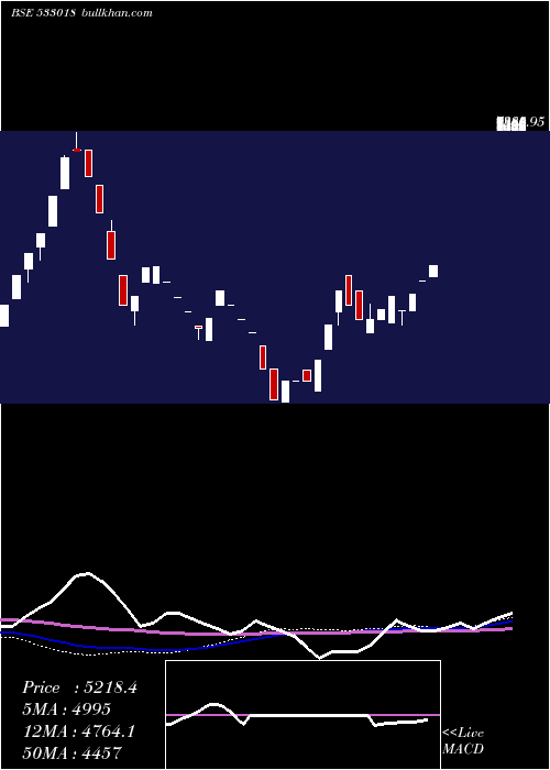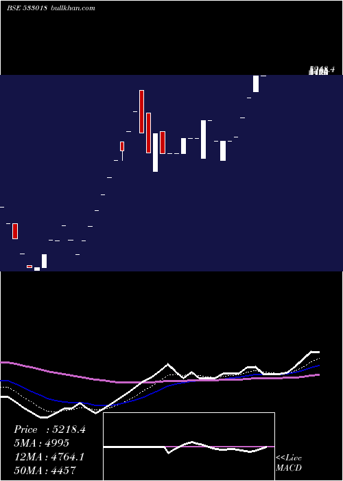 | Date | Closing | Open | Range | Volume | Fri 14 November 2025 | 5218.40 (0%) | 5218.40 | 5218.40 - 5218.40 | 0.3636 times | Mon 29 September 2025 | 5218.40 (5%) | 5040.00 | 5040.00 - 5218.40 | 0.6364 times | Mon 04 August 2025 | 4970.00 (4.8%) | 4970.00 | 4970.00 - 4970.00 | 0.0909 times | Wed 23 July 2025 | 4742.50 (9.53%) | 4330.00 | 4249.05 - 4742.50 | 1 times | Mon 30 June 2025 | 4330.00 (1.74%) | 4468.00 | 4123.55 - 5049.60 | 1.5 times | Fri 30 May 2025 | 4256.05 (21.43%) | 3340.00 | 3176.05 - 4256.05 | 1.6818 times | Mon 21 April 2025 | 3505.00 (4.99%) | 3338.30 | 3338.30 - 3505.00 | 0.0909 times | Wed 26 March 2025 | 3338.35 (-14.69%) | 3717.35 | 3000.00 - 3717.35 | 1.8636 times | Mon 24 February 2025 | 3913.00 (-14.26%) | 4335.65 | 3913.00 - 4335.65 | 1 times | Mon 27 January 2025 | 4563.80 (4.73%) | 4575.35 | 4563.80 - 4804.00 | 1.7727 times | Fri 27 December 2024 | 4357.50 (-11.79%) | 4693.00 | 3990.00 - 4693.00 | 1.6364 times |