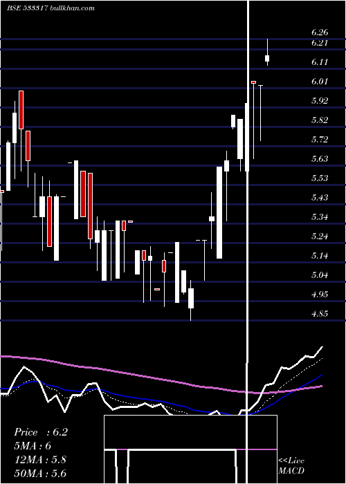 | Date | Closing | Open | Range | Volume | Fri 26 December 2025 | 6.18 (2.49%) | 6.15 | 6.13 - 6.26 | 0.2676 times | Wed 24 December 2025 | 6.03 (-0.17%) | 6.03 | 5.75 - 6.03 | 1.1838 times | Tue 23 December 2025 | 6.04 (1.68%) | 6.05 | 5.66 - 6.05 | 0.4649 times | Mon 22 December 2025 | 5.94 (1.37%) | 5.60 | 5.60 - 5.94 | 0.2376 times | Fri 19 December 2025 | 5.86 (-0.34%) | 5.66 | 5.60 - 5.86 | 2.426 times | Thu 18 December 2025 | 5.88 (4.07%) | 5.82 | 5.81 - 5.88 | 0.1416 times | Wed 17 December 2025 | 5.65 (0.53%) | 5.60 | 5.35 - 5.70 | 0.962 times | Tue 16 December 2025 | 5.62 (4.66%) | 5.16 | 5.16 - 5.62 | 1.9047 times | Mon 15 December 2025 | 5.37 (2.29%) | 5.35 | 5.21 - 5.49 | 1.9266 times | Fri 12 December 2025 | 5.25 (0%) | 5.25 | 5.05 - 5.25 | 0.4852 times | Thu 11 December 2025 | 5.25 (4.79%) | 5.25 | 5.25 - 5.25 | 0.4783 times |