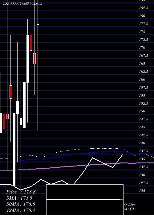 | Date | Closing | Open | Range | Volume | Fri 26 December 2025 | 167.60 (0%) | 167.60 | 167.60 - 167.60 | 0.0042 times | Wed 24 December 2025 | 167.60 (-5.66%) | 187.00 | 165.95 - 187.00 | 0.3591 times | Tue 23 December 2025 | 177.65 (8.95%) | 166.00 | 162.00 - 187.00 | 0.9754 times | Mon 22 December 2025 | 163.05 (1.4%) | 160.00 | 145.20 - 166.90 | 3.6294 times | Fri 19 December 2025 | 160.80 (0.44%) | 160.10 | 145.50 - 161.00 | 0.2762 times | Thu 18 December 2025 | 160.10 (-4.93%) | 160.00 | 155.95 - 162.10 | 0.6056 times | Wed 17 December 2025 | 168.40 (0.84%) | 166.00 | 164.00 - 174.00 | 1.7765 times | Tue 16 December 2025 | 167.00 (-8.67%) | 184.00 | 165.95 - 184.00 | 0.6864 times | Mon 15 December 2025 | 182.85 (7.46%) | 170.15 | 160.00 - 188.00 | 1.6532 times | Fri 12 December 2025 | 170.15 (-0.5%) | 170.15 | 170.00 - 170.15 | 0.034 times | Wed 10 December 2025 | 171.00 (-1.13%) | 172.50 | 171.00 - 172.50 | 0.1594 times |