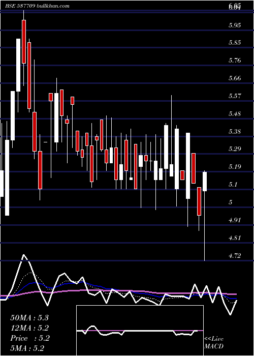 | Date | Closing | Open | Range | Volume | Wed 24 December 2025 | 5.19 (4.64%) | 5.09 | 4.72 - 5.20 | 1.7616 times | Tue 23 December 2025 | 4.96 (-3.31%) | 5.11 | 4.88 - 5.11 | 1.2733 times | Mon 22 December 2025 | 5.13 (-5%) | 5.29 | 5.13 - 5.29 | 1.2055 times | Fri 19 December 2025 | 5.40 (4.85%) | 5.05 | 4.90 - 5.40 | 2.3115 times | Thu 18 December 2025 | 5.15 (-4.98%) | 5.20 | 5.15 - 5.20 | 0.877 times | Wed 17 December 2025 | 5.42 (3.63%) | 5.10 | 5.01 - 5.44 | 0.6898 times | Tue 16 December 2025 | 5.23 (-3.86%) | 5.17 | 5.17 - 5.60 | 0.4267 times | Mon 15 December 2025 | 5.44 (4.41%) | 5.21 | 5.10 - 5.45 | 0.6013 times | Fri 12 December 2025 | 5.21 (-0.76%) | 5.15 | 5.15 - 5.37 | 0.3876 times | Thu 11 December 2025 | 5.25 (0%) | 5.15 | 4.99 - 5.39 | 0.4658 times | Wed 10 December 2025 | 5.25 (0%) | 5.25 | 5.20 - 5.35 | 0.0952 times |