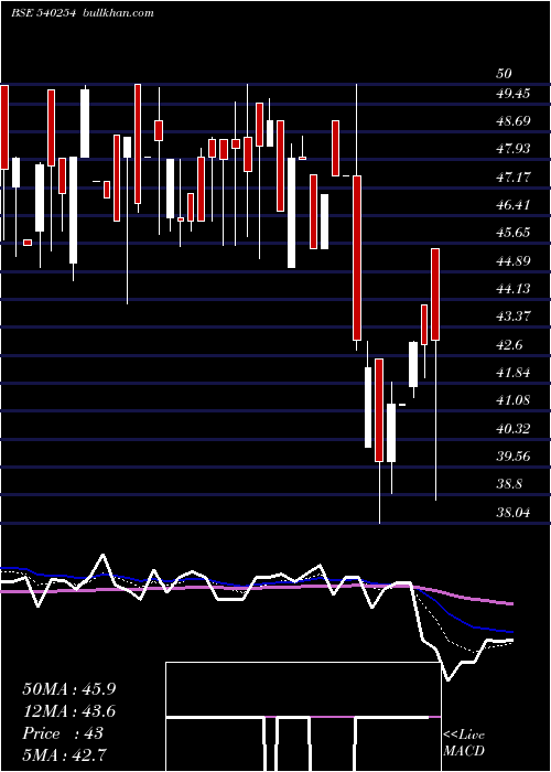 | Date | Closing | Open | Range | Volume | Tue 23 December 2025 | 42.89 (-0.16%) | 43.99 | 42.00 - 43.99 | 0.0122 times | Mon 22 December 2025 | 42.96 (4.12%) | 41.75 | 41.45 - 42.98 | 0.5168 times | Fri 19 December 2025 | 41.26 (0%) | 41.25 | 41.25 - 41.26 | 0.0213 times | Thu 18 December 2025 | 41.26 (3.9%) | 39.71 | 38.85 - 41.88 | 0.6137 times | Wed 17 December 2025 | 39.71 (-6.03%) | 42.50 | 38.04 - 42.50 | 1.8779 times | Tue 16 December 2025 | 42.26 (-1.72%) | 40.11 | 40.11 - 42.99 | 0.0901 times | Mon 15 December 2025 | 43.00 (-9.47%) | 47.50 | 42.75 - 50.00 | 6.6807 times | Fri 12 December 2025 | 47.50 (0%) | 47.50 | 47.50 - 47.50 | 0.0034 times | Thu 11 December 2025 | 47.50 (1.11%) | 49.00 | 47.50 - 49.00 | 0.1512 times | Wed 10 December 2025 | 46.98 (3.25%) | 45.50 | 45.50 - 46.98 | 0.0327 times | Tue 09 December 2025 | 45.50 (-5.13%) | 47.51 | 45.50 - 47.51 | 0.1807 times |