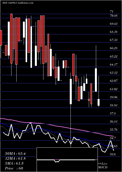 | Date | Closing | Open | Range | Volume | Fri 26 December 2025 | 60.00 (0%) | 60.00 | 60.00 - 60.00 | 0.1423 times | Wed 24 December 2025 | 60.00 (-6.22%) | 59.20 | 59.00 - 63.00 | 0.6378 times | Tue 23 December 2025 | 63.98 (4.89%) | 61.00 | 61.00 - 66.95 | 1.3864 times | Thu 18 December 2025 | 61.00 (2.75%) | 61.00 | 61.00 - 61.00 | 0.0105 times | Tue 16 December 2025 | 59.37 (-0.79%) | 62.00 | 59.01 - 62.00 | 0.1898 times | Mon 15 December 2025 | 59.84 (-4.49%) | 60.01 | 59.00 - 60.95 | 0.2952 times | Fri 12 December 2025 | 62.65 (0.98%) | 62.00 | 62.00 - 63.29 | 0.2109 times | Wed 10 December 2025 | 62.04 (0.55%) | 61.10 | 61.10 - 63.00 | 0.9963 times | Tue 09 December 2025 | 61.70 (3.18%) | 60.00 | 60.00 - 62.87 | 0.7222 times | Mon 08 December 2025 | 59.80 (-4.04%) | 61.61 | 59.80 - 62.67 | 5.4085 times | Fri 05 December 2025 | 62.32 (-1.19%) | 63.00 | 60.01 - 65.75 | 3.2947 times |