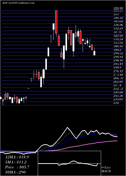 | Date | Closing | Open | Range | Volume | Fri 26 December 2025 | 305.65 (-0.55%) | 300.10 | 300.10 - 310.00 | 1.1436 times | Wed 24 December 2025 | 307.35 (-1.51%) | 314.00 | 306.30 - 314.00 | 0.5585 times | Tue 23 December 2025 | 312.05 (-2.3%) | 311.00 | 311.00 - 321.35 | 0.6117 times | Mon 22 December 2025 | 319.40 (1.08%) | 316.00 | 313.00 - 323.00 | 0.6915 times | Fri 19 December 2025 | 316.00 (-1.56%) | 315.10 | 315.10 - 321.00 | 0.4255 times | Thu 18 December 2025 | 321.00 (1.86%) | 319.40 | 305.05 - 322.00 | 0.5053 times | Wed 17 December 2025 | 315.15 (-4.99%) | 331.70 | 315.15 - 334.50 | 2.1011 times | Tue 16 December 2025 | 331.70 (2.06%) | 325.00 | 317.30 - 335.00 | 0.9574 times | Mon 15 December 2025 | 325.00 (-1.17%) | 330.00 | 323.05 - 339.80 | 0.8245 times | Fri 12 December 2025 | 328.85 (4.78%) | 305.35 | 298.20 - 329.50 | 2.1809 times | Thu 11 December 2025 | 313.85 (-4.74%) | 333.00 | 313.00 - 333.00 | 1.6755 times |