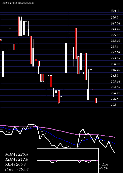 | Date | Closing | Open | Range | Volume | Wed 24 December 2025 | 204.80 (-6.03%) | 205.00 | 204.00 - 205.00 | 0.6024 times | Tue 23 December 2025 | 217.95 (6.32%) | 217.95 | 217.95 - 217.95 | 0.1205 times | Fri 19 December 2025 | 205.00 (-2.84%) | 197.50 | 197.50 - 217.95 | 2.1687 times | Thu 18 December 2025 | 211.00 (-2.31%) | 228.85 | 211.00 - 228.90 | 0.9639 times | Wed 17 December 2025 | 216.00 (-5.64%) | 215.05 | 215.00 - 216.00 | 0.4819 times | Tue 16 December 2025 | 228.90 (6.47%) | 218.00 | 212.60 - 228.90 | 0.4819 times | Mon 15 December 2025 | 215.00 (-4.44%) | 226.70 | 214.95 - 226.70 | 3.6145 times | Thu 11 December 2025 | 225.00 (-3.43%) | 245.25 | 225.00 - 245.25 | 0.8434 times | Wed 10 December 2025 | 233.00 (1.3%) | 225.00 | 220.00 - 233.00 | 0.4819 times | Tue 09 December 2025 | 230.00 (-4.88%) | 230.00 | 230.00 - 230.00 | 0.241 times | Mon 08 December 2025 | 241.80 (2.76%) | 241.50 | 225.05 - 255.90 | 2.5301 times |